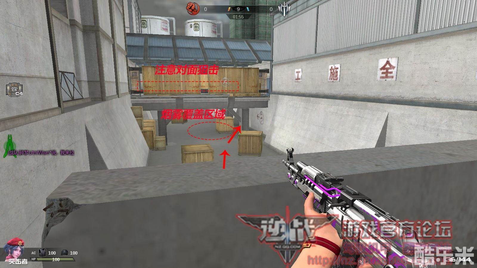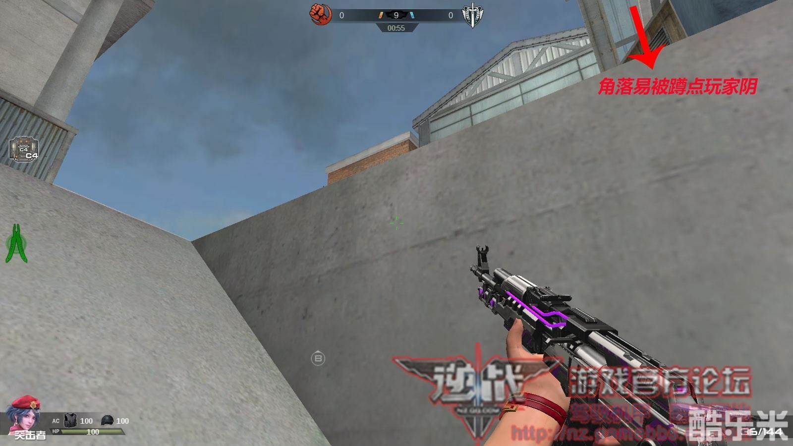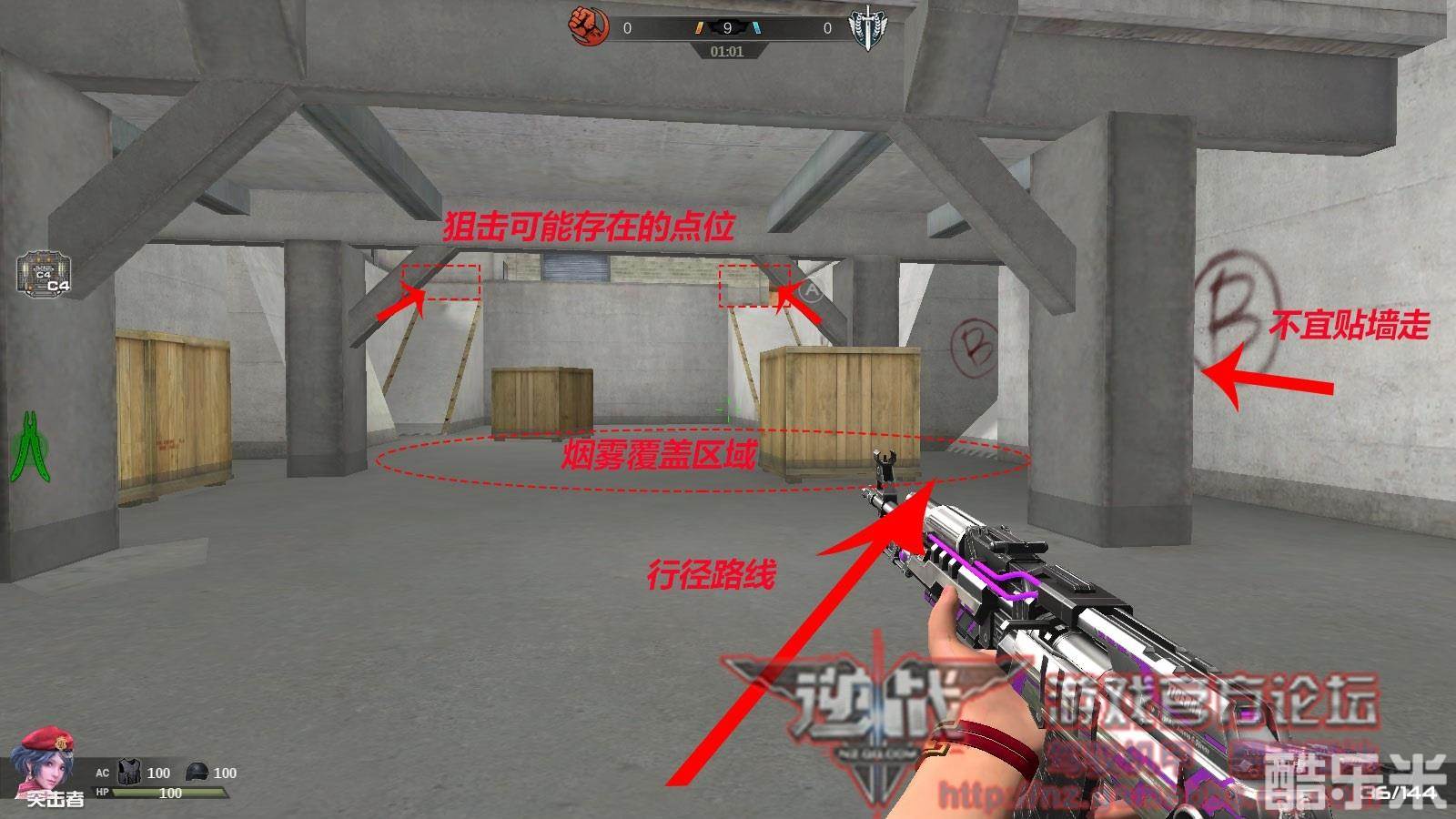 但是想要出B道就有一点点的困难了,警家方向的狙击可以说是每局必有的存在,而他们的瞄点都是B道口,这时候进攻玩家就需要来丢投掷道具来干扰对方的视野,不过是丢闪光还是烟雾全凭个人爱好了,虽然闪光的瞬时视野干扰能力比烟雾强,但是烟雾好在持久性,个人偏向于丢烟雾。