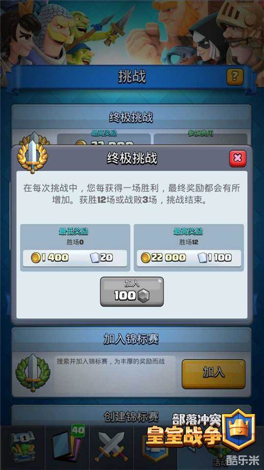 获取解析:锦标赛是CR中一个非常重要获取金币的途径,并且这个模式在任何时候都可以挑战,不过会需要一定的宝石入场。锦标赛一共分为两种,分别是‘普通挑战’和‘终极挑战’,普通挑战需要的宝石较低,金币获取也较低,难度同样偏低。而中间挑战在各方面都会升高很多,不过一旦取得12胜,那么最终的奖励也很诱人(22000金币),而普通挑战的金币获得为2000,除了金币外还能够得到很多卡牌。