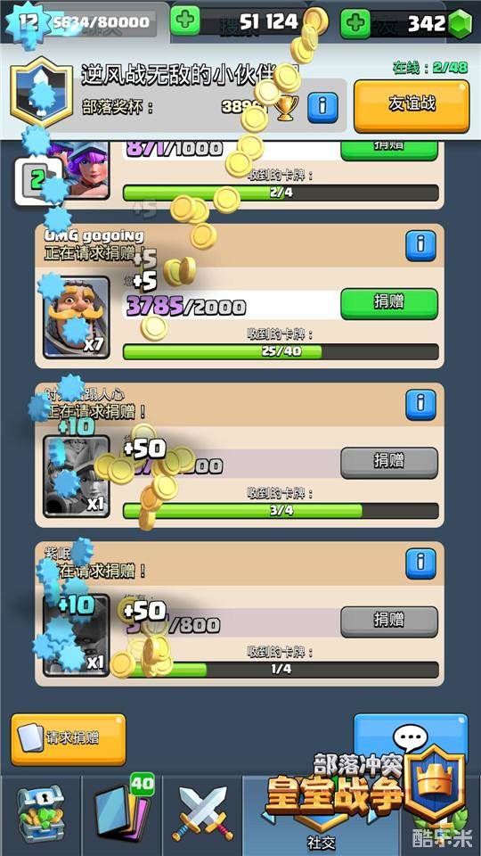部落在捐赠中也是能够获得少量的金币,当部落的队友请求卡牌时,如果我们有较多该类单位卡牌,可以通过捐赠来获取一定的经验和金币,卡牌综合的稀有度越高,获得的奖励也相应越多,特别是一些日常不怎么需要的卡牌,在捐赠时会很舒服,既能得金币又可以帮助部落朋友。