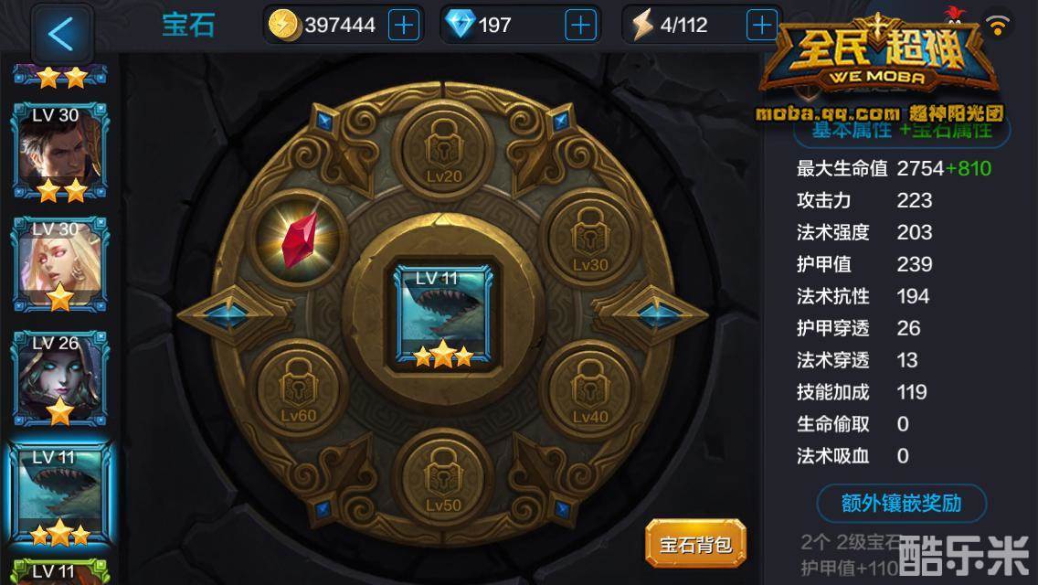 宝石上面,我们就要往肉些的或者抗性的宝石上去选择,例如生命宝石,法抗宝石,护甲宝石这些,在咱们镶嵌进去合适的宝石后,可以在我们的属性那栏上看到增加值哦!咱们霸道海鲨王,可是个前排英雄,咱们要肉!!~千万别去放一些什么法强攻击宝石,那些宝石对海鲨王来说,然并卵,起不了多大的作用!