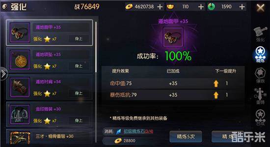 [精炼]和[强化]的区别在于,精炼是100%成功的。当然加成的属性也相对较小。作为游戏中最为稳妥的提升装备的方法,精炼在前期带来的收益非常可观,而且[初级精炼石]的获取难度也不大。可以说是前期提升装备战力的最好办法之一。因为100%的成功,所以各位放心大胆的去精炼吧!