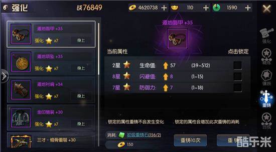 [重铸]系统的随机性最强,会随机在装备上赋予不同星级的属性。当然如果洗出了极品属性可以选择锁定它。但是作为代价是锁定属性会增加此次重铸的消耗。