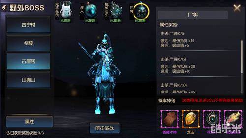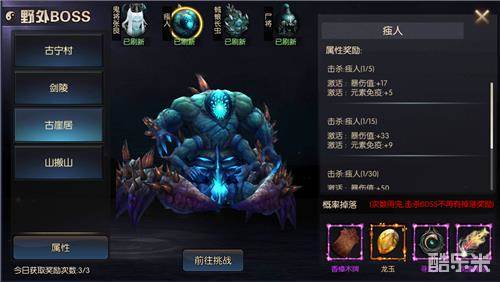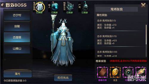 当你的等级到达55级,就可以在野外BOSS界面里解锁古崖居区域,有古代的将军、军师,也有沾了邪气的怪物,每一个BOSS都有不同的技能。只会出现在大地图里,你可以约上你的小伙伴一同击杀他们,要注意的是,奖励只有一个人能获得哦!