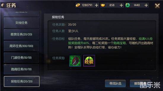 接下来就是大名鼎鼎的“探险任务”啦。探险任务可以一个人做,也可以选择和其他玩家组队一起做。当然小编更推荐各位看官找队伍一起做,因为组满4人经验奖励提升60%呢!如果实在组不满4人,告诉你一个投机取巧的小方法:你可以在世界上叫几个“假人”充数。所谓的假人呢,就是其实他并不做这个任务,但是他可以帮你凑人头,队伍里有“假人”凑满四人其他做任务的队员也是享受60%加成的喔。探险任务不仅有大量的经验,更能够提供珍贵的“跑商宝箱”,可以开出各种各样的跑商物品,经验任务品双丰收,一举两得。但是探险任务门槛比较高,也比较耗时,所以各位有时间的看官千万不要吝啬自己手机的电量,任务做起来!
