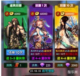 在伙伴招募中我们可以看到有三种玩法,所消耗的道具数量也不尽相同,系统每天也会送免费的招募次数的哦。