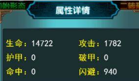 在一级的情况下,生命14722,攻击1782,闪避与韧性都是940,其余为0.