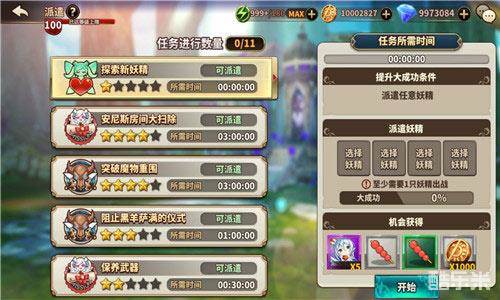 派遣玩法也升级?没错,在新版本中,妖精的派遣玩法也进行了升级改造。派遣功能中,每天会有10个不同的任务,玩家最多可以派遣4名妖精最少派遣1名妖精进行任务,正在派遣中的妖精无法再被派遣到其他任务中,在派遣任务完成后,玩家可以获得技能升级书和妖精升级道具以及大量金币。每天的任务星级都会有所标注,任务的完成时间也有长有短,当然每个任务的奖励也会有所不同,玩家可以根据自己的需要来选择派遣任务,像小编这种患了技能书缺乏症的小伙伴们,不要犹豫赶快去做派遣任务吧!