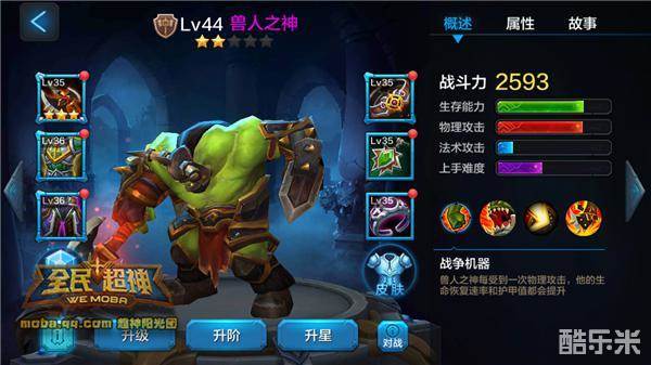 战争机器(被动技能):兽人之神每受到一次物理攻击,他的生命回复速率和护甲值都会提升。这个技能可以使欧克在3V3中即是出半肉装备也会变的很肉!