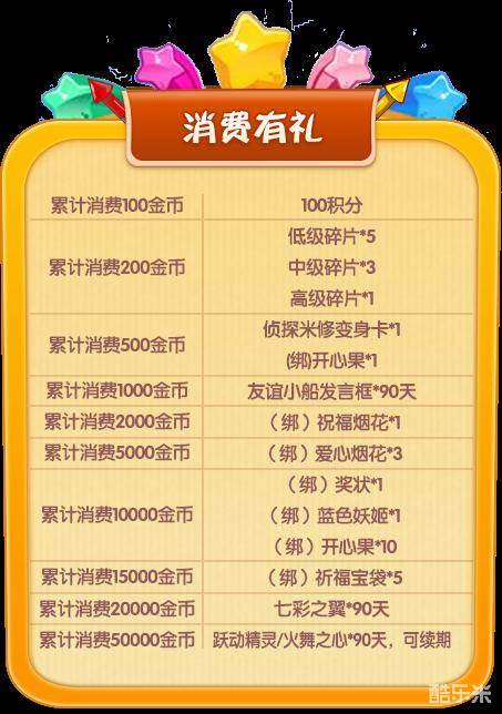 活动内容:活动期间,累计消费金币(购买大咖、金砖、投资不计)达到相应数量后可领取对应奖励哦!每种奖励每位玩家仅能领取一次。
