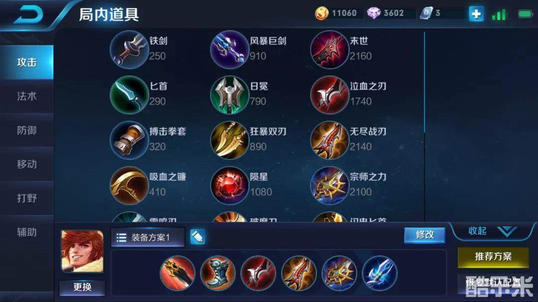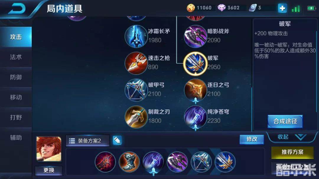 熟悉了裴擒虎的技能之后,在出装方面我们要尽量根据个人喜好跟所打的位置,结合对局详情出装,如果要打线上消耗,推荐出攻速流,出装 如下