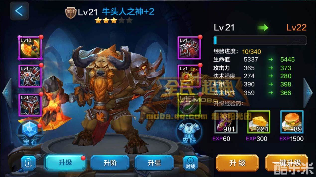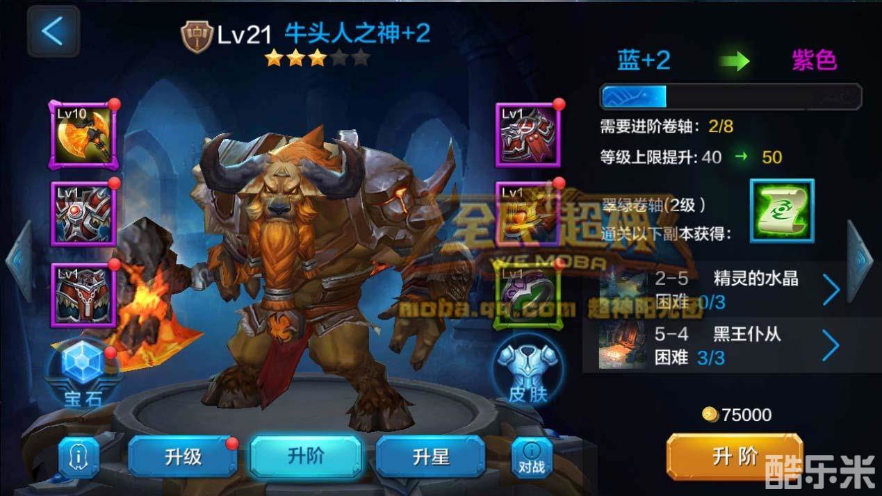阶级方面,英雄进阶需要卷轴,牛头属于肉盾,需要不同等级的翠绿卷轴。升阶卷轴可以通过刷困难闯关关卡随机获得,只要小伙伴们自己努力,升阶到紫1不是梦。