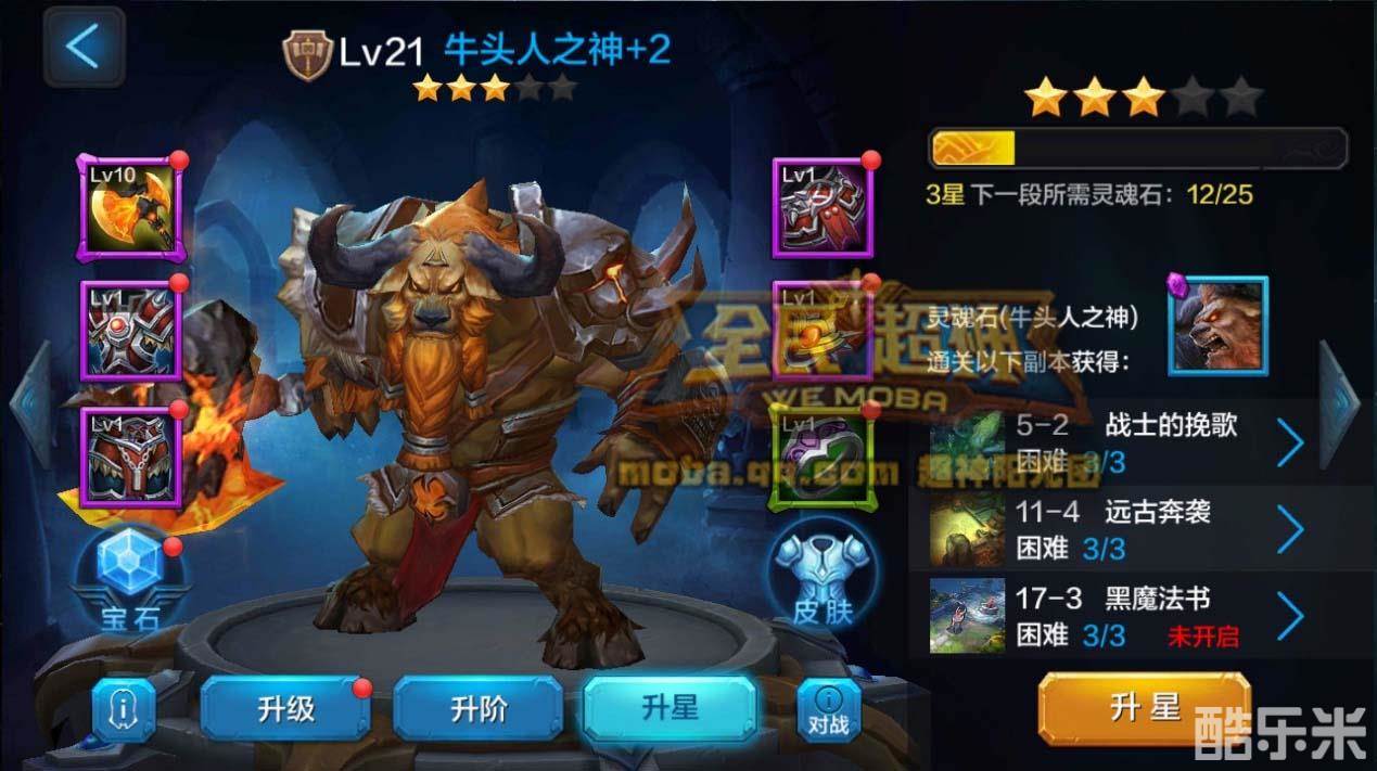 最后一个就是英雄的星等,牛头初始为3星,需要通过灵魂石不断升星。每个星等之间升级需要5次,3星升4星每次需要25个灵魂石,总计需要125个灵魂石;4星升5星每次则是需要50个灵魂石,总计需要250个灵魂石。牛头灵魂石获取还是比较简单的,只需要每天坚持刷闯关副本就可以。所以只要持之以恒,升级到5星并不是梦。