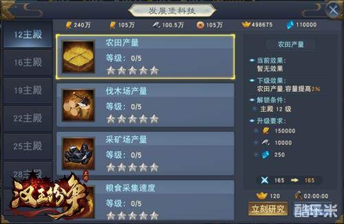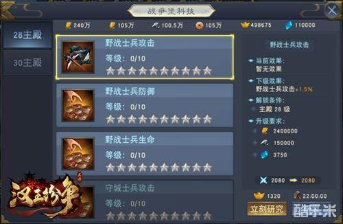 战争堡将大幅提升士兵攻击,士兵防御,士兵生命等属性。发展堡则将大幅提升城内收获,城外采集,治疗士兵等属性。通过同时运行三个科技研发队列,城主实力将得到极大提升。