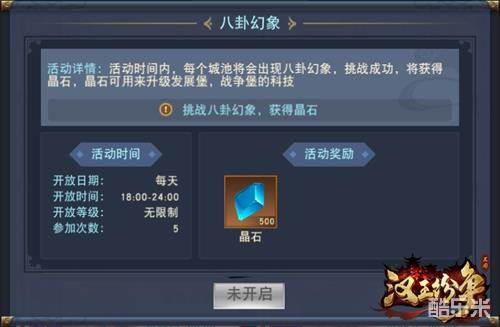 城主们可通过参与八卦幻象活动加速科技发展。城主成功挑战八卦幻象即可获得晶石,晶石可用于战争、发展堡的科技研究。可谓以战养战,愈战愈勇!