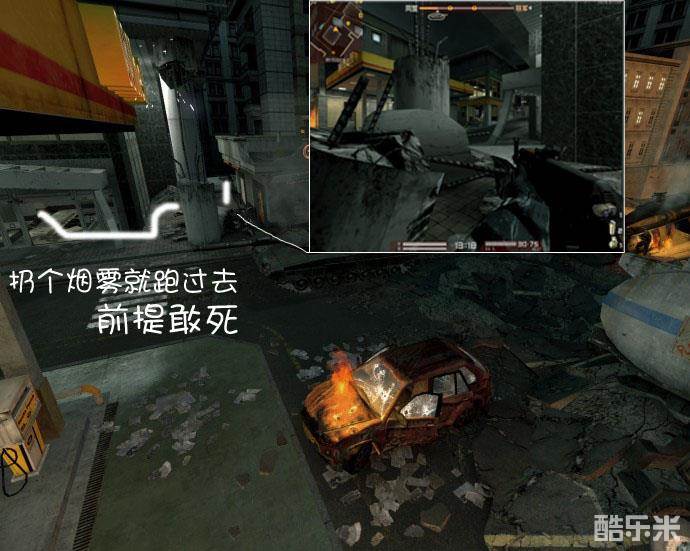 此地图只有5个地方可以拿火箭筒7个目标地点共4个转角点 地图比起风暴突击稍微小一点点但是很刺激很强大 以下是我做的小攻略献给新手 这一篇是灰烬的进攻篇 我们有两条路进攻 第一:A点技术中心只是转弯过去但是对面楼是敌人的老家所以我们仍个烟雾做掩护 第二:是走B点加油站还是扔个烟雾保护自己冲过去咖啡店