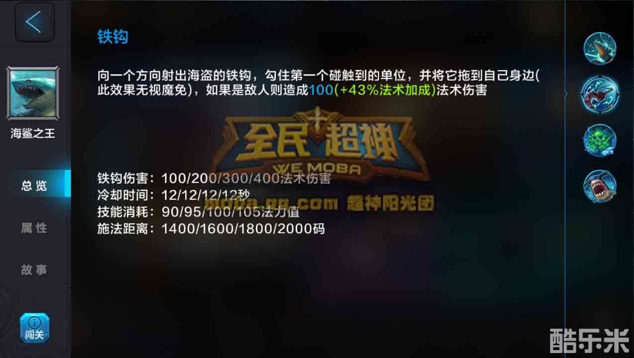 解析:超神中超远距离的控制技能,特殊的机制让他既能钩敌方也可以钩友方。所以衡量一个鲨鱼玩的好不好的标志就在于此了。是在万军丛中钩出敌方ADC,还是将即将5杀的队友钩回来,成败只在一念间啊。