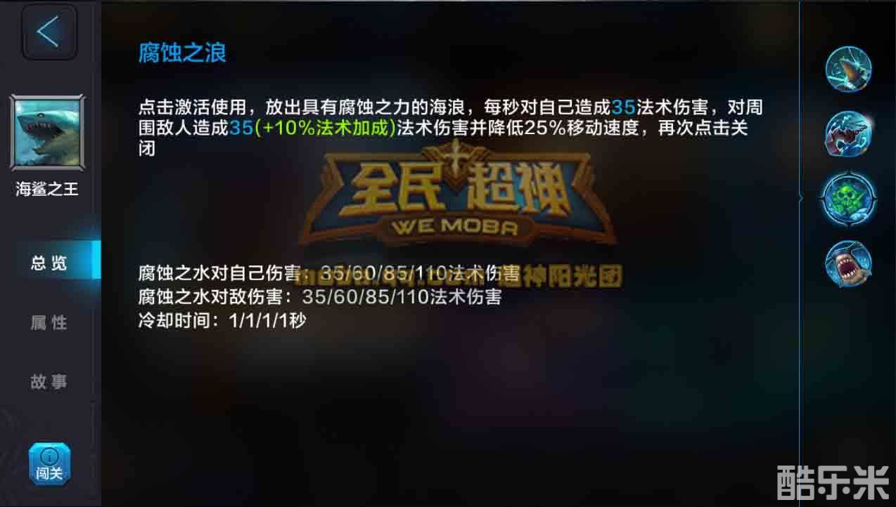 。之所以不主加2技能腐蚀之浪,是因为2技能伤人又伤己,并且鲨鱼作为一个肉盾英雄,主要是负责控制对方英雄保护己方英雄,而1技能随着等级的提升,施法距离也不断提升。