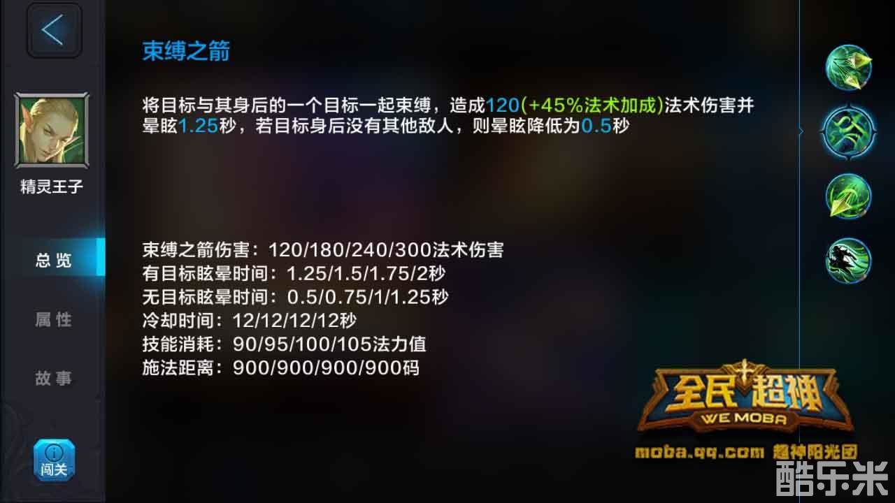 束缚之箭:精灵王子将目标与其身后的一个敌方英雄束缚并造成法术伤害。若目标后面没有其它敌方英雄,则眩晕时间减少。