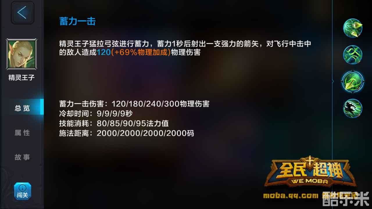 蓄力一击:精灵王子用1秒的时间为他的弓蓄力,射出一支强力的箭矢。这支箭会对飞行中击中的敌方单位造成物理伤害。