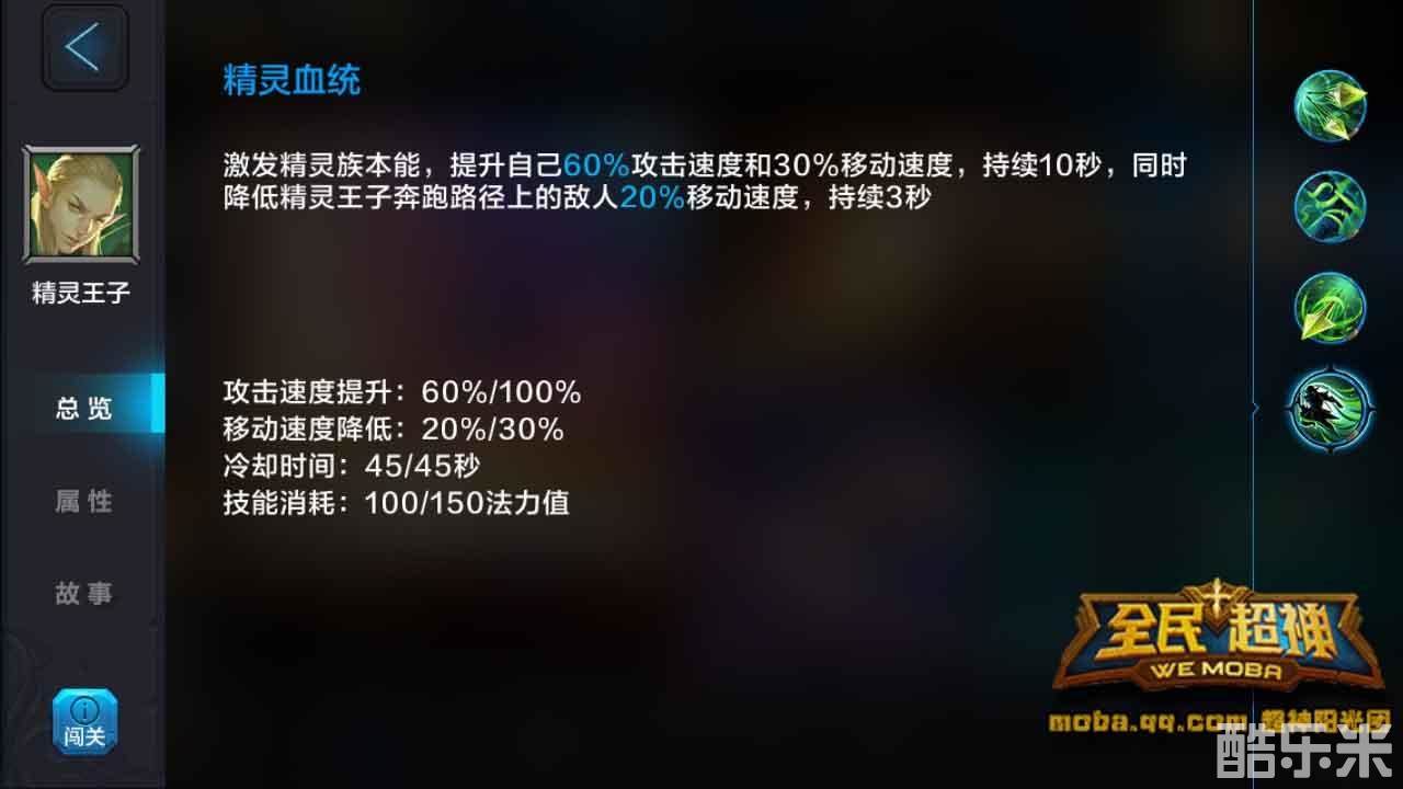 精灵血统:精灵王子激发精灵族本能,提升自己的攻击速度,并且提升移动速度,同时降低精灵王子奔跑路径上敌人的移动速度。