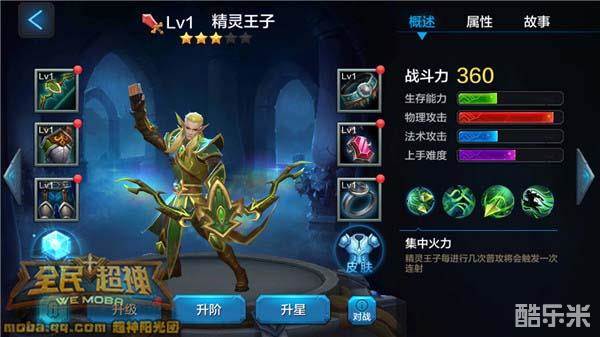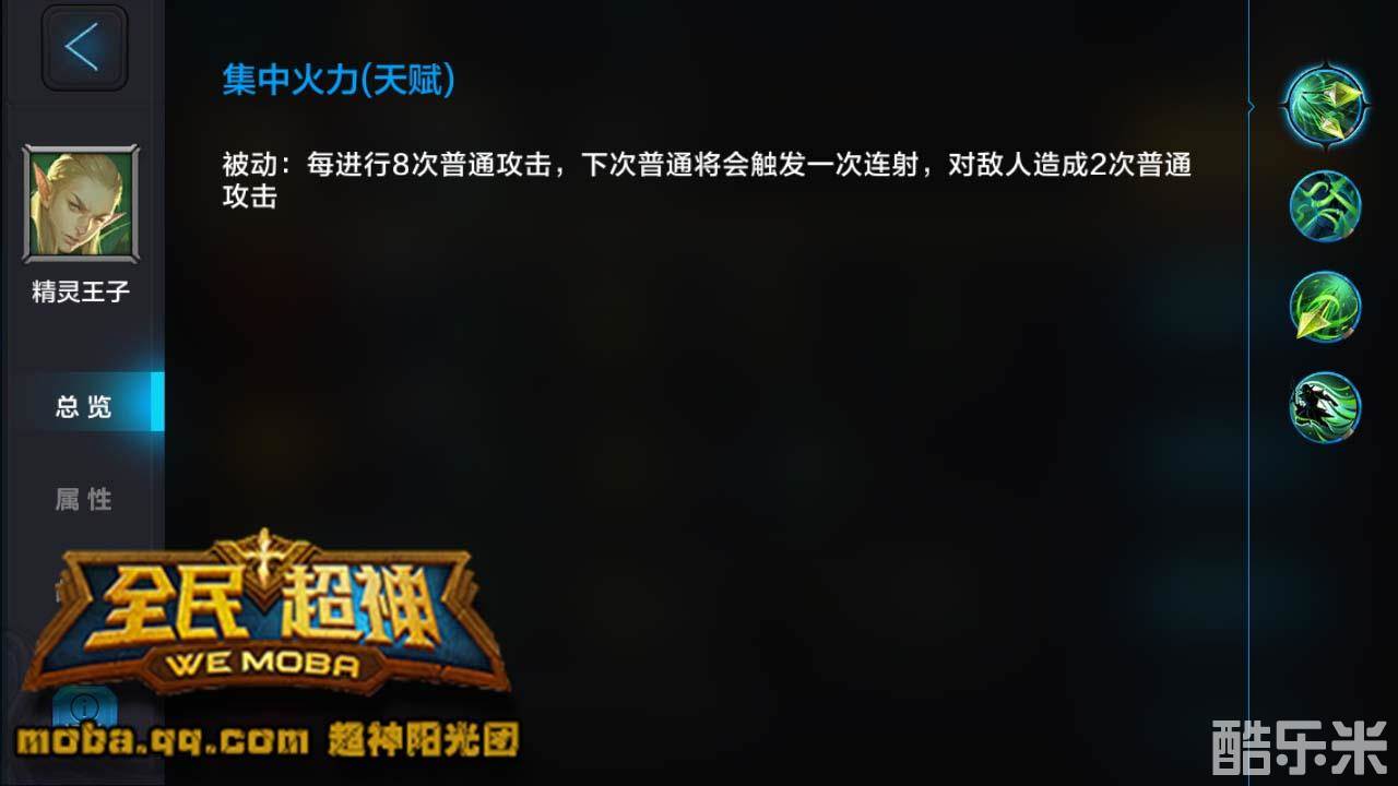 1、集中火力被动技能:精灵王子每进行8次普攻,下次普通将会触发一次连射,对敌人造成2次普通攻击。