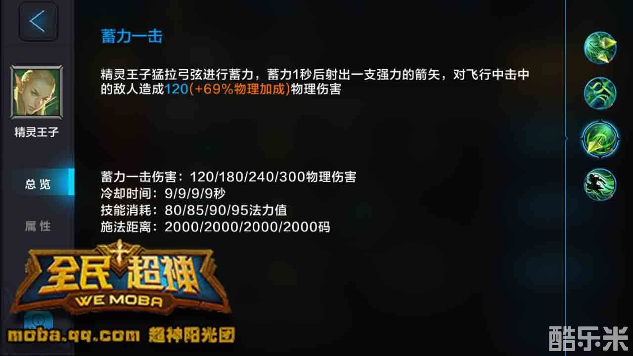 技能分析: 蓄力一击,该技能是物理伤害的,也是符合精灵王子英雄的自身属性,该技能在攻击距离上还是蛮远的,单体攻击,作为补刀技能还是不错的。如果预判的比较准,收割残血也是相当好用的。