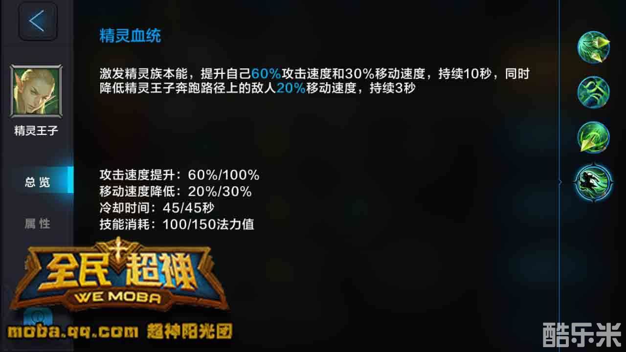 4、精灵血统:激发精灵族本能,提升自己的攻击速度,提升移动速度,同时降低精灵王子奔跑跑径上敌人的移动速度。