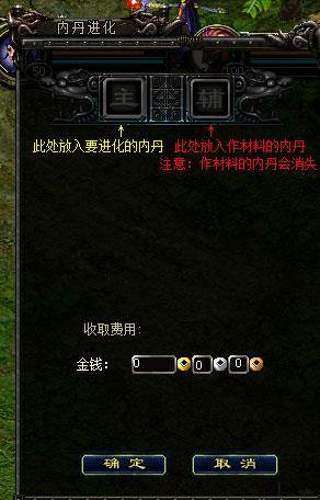 3、在“主”格子中放入要进化的内丹,在“辅”格子中放入作材料的内丹(作材料的内丹会消失);