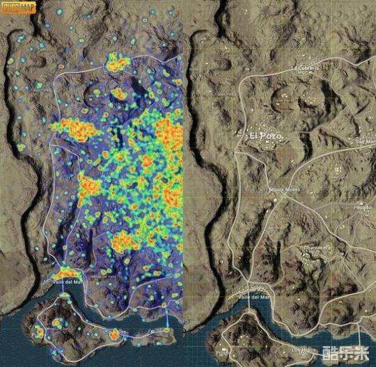 从地图的左半边来看,由于沙漠地图不适合堵桥战术,所以发生在桥上的交火很少。大部分交战都集中在建筑物比较秘籍的地方。但是唯有一个地方是例外,那就是沙漠地图里“刚枪怪”们最喜欢去的地方--Pecado。这个地方不仅中心是一片红色,连周围几乎没有房子的野区也是全线飘红。可见大家的战场不仅在Pecado里面,周围的很大一部分面积都是交火频率非常高的地方。
