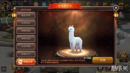 当然我们在新开服期间还有一个很重要的活动那就是开服的嘉年华。三天之内嘉年华积分攒到1500分就可以兑换神兽坐骑。大家是不是觉得很拉风呢?