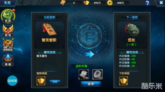 最后编辑于7年前无双系统分为官职、称号、武将助战、炼魂。