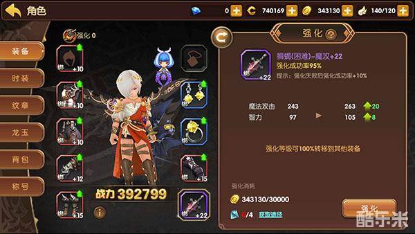 装备强化不怎么费钱,但相当费材料, 3之前成功率是100%,但从3到4真心不像系统说的成功率很高,起码在80%左右,我有连续强化3次连败的记录,这不算什么,越往后强化消耗材料越多,而且成功率越低,虽然装备不会碎,但是材料消耗还是很吓人的。前期强化超过15之后成功率就只有50%以下,那材料用的真心痛。装备等级超过35级时就开始大量消耗蓝色玛瑙(十分稀缺,不建议龙币购买当然土豪请无视),我们的原则是全靠RP强化。