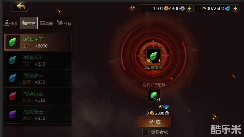 在背包界面,点击“制作”按钮,即可对强化石、宝石及其它物品进行合成或分解。