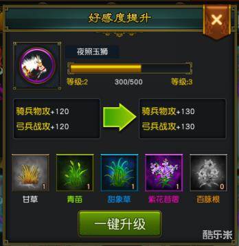 2.喂食战马草料,可以提升战马的好感度,不同的草料可提升的好感度不同;
