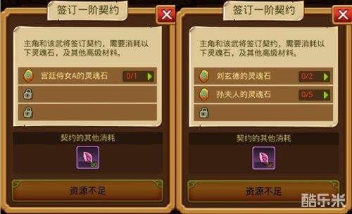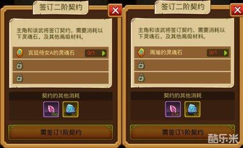武将的契约有一阶和二阶之分,在契约时,我们需要先完成一阶的契约。不同品质的武将的一阶契约需要的材料是相差比较大的,像白将、绿将和蓝将这三类低品质的武将,契约的材料都是自己的灵魂石,而像紫将、金将、闪金这三类高品质的武将,一阶契约的材料不仅需要两个不同武将的灵魂石,而且灵魂石数量也比较大。所以说,高品质的武将契约起来难度很高。在契约的过程中,除了灵魂石,还会消耗数量不等的荣誉碎片。武将的品质越高,需要消耗的荣誉碎片就越多。