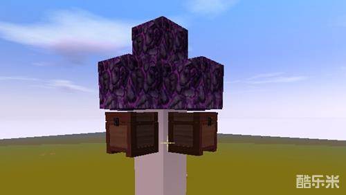 2.在柱子的顶部用黑晶石和箱子围个下图中的样子,上面用5个黑晶石盖着(黑晶石中间留空),然后下面放四个箱子;