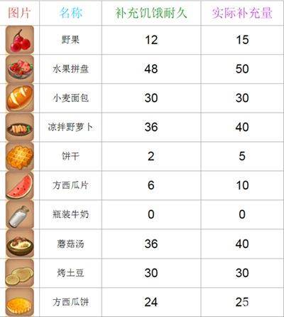 所以说如何获得这个“饥饿耐力”呢?和补充饱食度条一样的方式,都是吃东西,并且不同的食物所补充的“饥饿耐力”的数值又不一样。