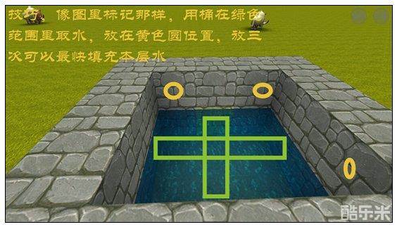 技巧:像下图里标记那样,用桶在绿色范围里取水,然后放在黄色圆的位置(挨着方块放),放3次就可以快速填充本层的水了!