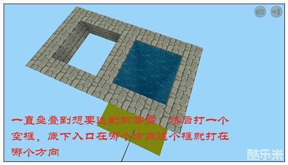 4.然后一直往上垒,叠到自己想要的高度,比如说刷石机或者刷怪塔的平台高度,再来,在边上打一个空的框,这个框要对着地面入口的位置(也就是有水的位置)。