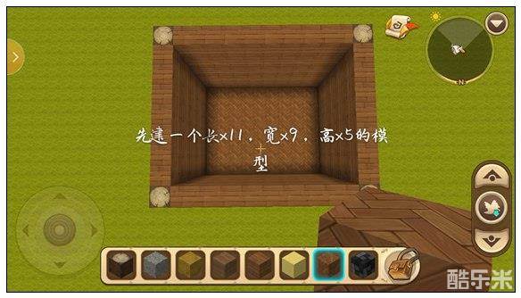 首先用木板和木头建一个长11宽9高5的盒子模型,四个角用原木搭;