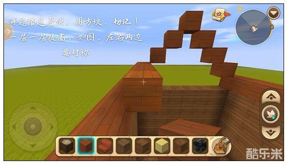 接着是搭建屋顶,用方块如下图一层一层提高,做成阶梯状,左右两边要对称。