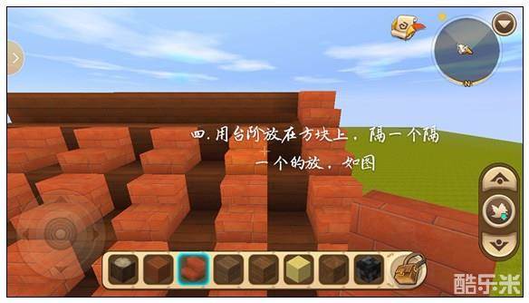然后是装饰屋顶,用台阶放在屋顶上,一排一排之间空一排地放,如下图。