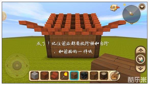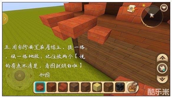 在屋檐最边上的那一格,把台阶提高2层,一层比一层高!