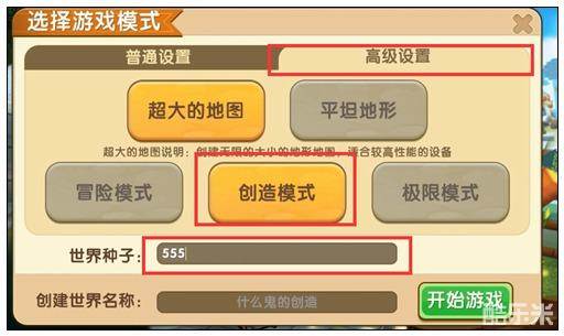 2.重新创建一个创造模式的地图,在高级设置中选择-创造模式,并且填上刚才生存模式中复制出来的世界种子,这样一来,你进入创造模式后就和原来的地图一模一样啦~