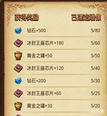 接下来计算单个冈布奥雕像成本(从零开始,不包括一座建造时间10多小时~20多小时,金币花销数量以及建造时间和雪山科技等级有关,先不管有没有出的,毕竟图鉴已有,如图)