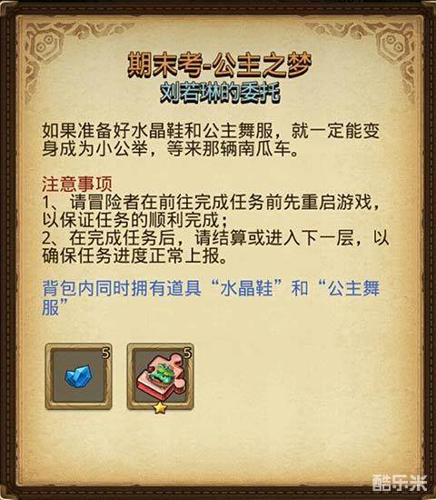 任务要求:背包内同时拥有道具“水晶鞋”和“公主舞服”