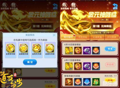 相较于金仙而言,金色元神的获取相对来说有一定的难度。但在4月15日至4月20日,《道友请留步》开启限时金色元神活动,登录即可获得金色元神大礼包,完成元神主题活动更有机会获得大量金色元神专属升级材料,缺少金色元神的道友们千万不要错过,赶紧来刷一波吧!