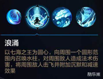 浪涌:以七海之王为圆心,向周围一个圆形范围内召唤水柱,对周围敌人造成法术伤害,将周围敌人击飞并附加沉默和减速效果