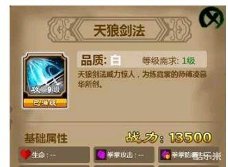 天狼剑法的品质是白,等级需求为1级。建议玩家将此剑法刷至满级,以下是天狼剑法掉落的区域: