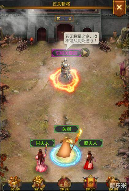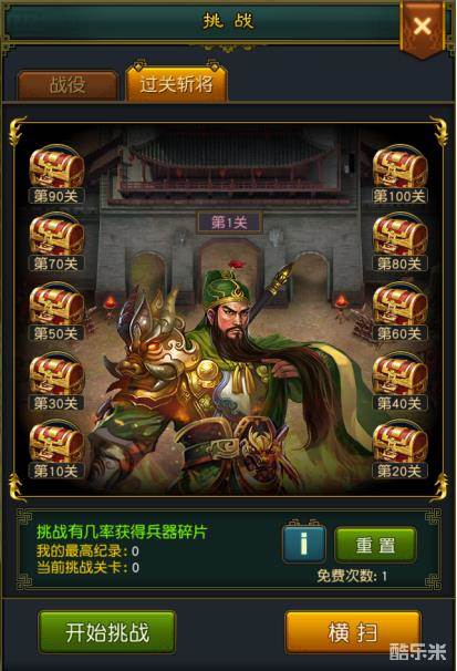 过关斩将总共有100关,每关都会有一个守关将阻碍关公的去路,点击守将即可进入备战界面,战胜此人才能继续通关。